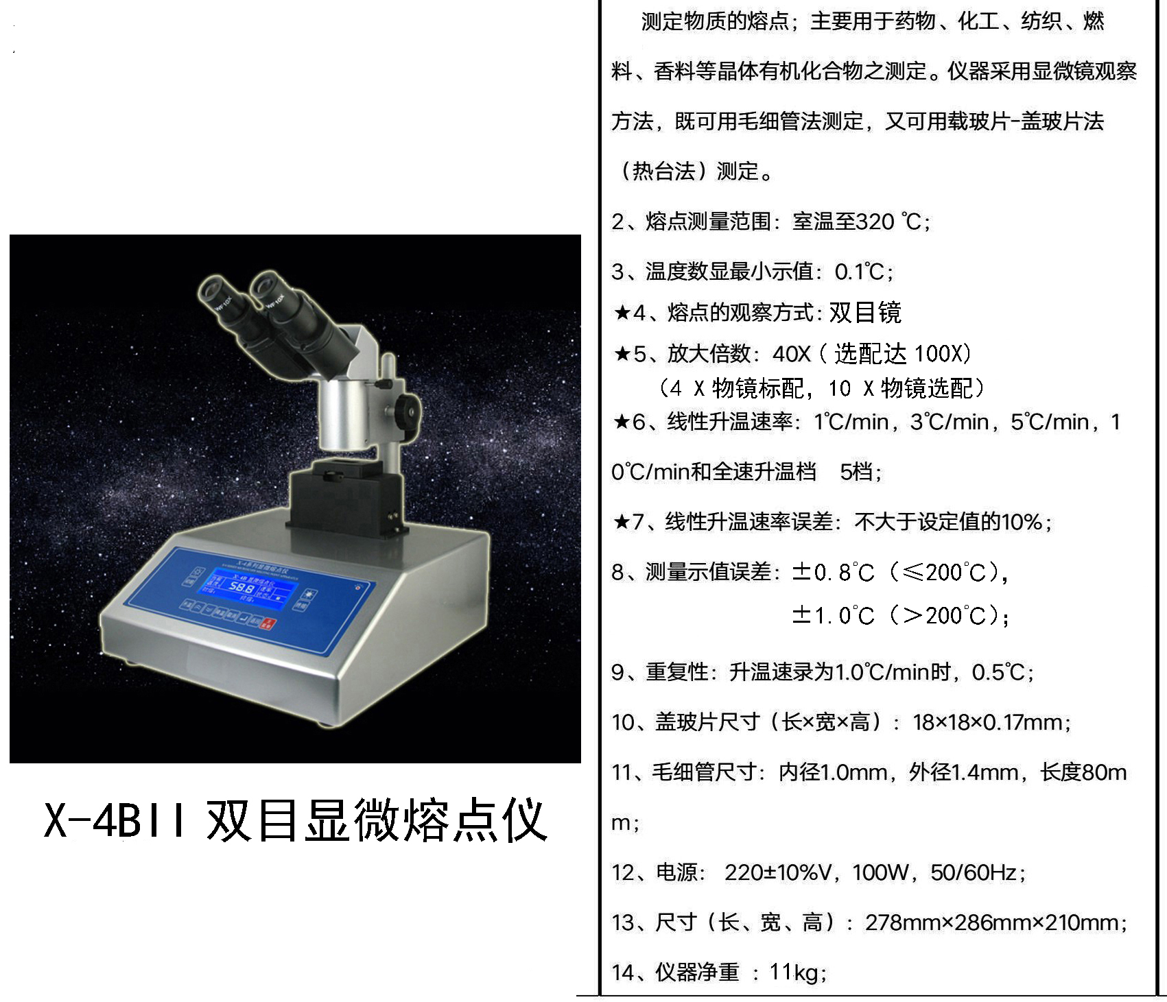 1、仪器采用显微镜观察方法,既可用毛细管法测定,又可用载玻片-盖玻片法(热台法)测定;